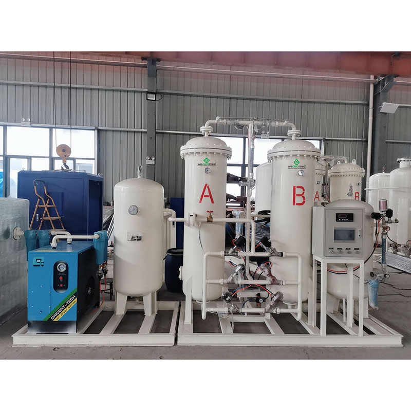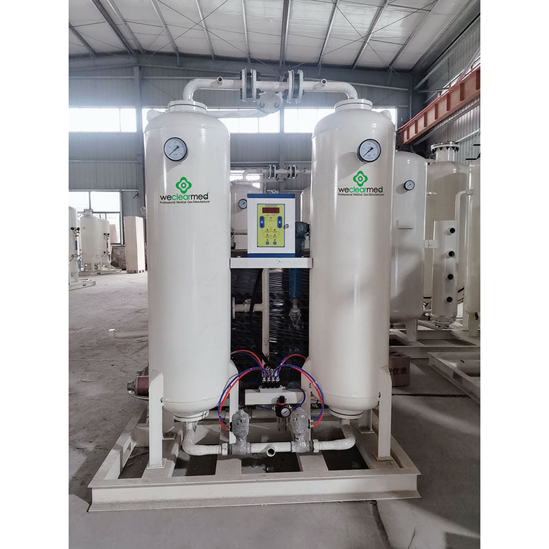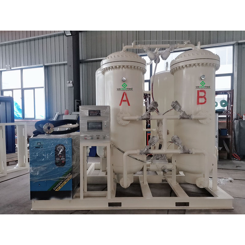 हवा पहले एयर कंप्रेसर में जाती है, फिर रेफ्रिजरेटेड एयर ड्रायर के माध्यम से सुखाई और शुद्ध की जाती है। फिर सामान्य तापमान कम दबाव के तहत, ऑक्सीजन सोखने के लिए जिओलाइट आणविक छलनी की चयनात्मकता का उपयोग किया जाता है। पीएसए मेडिकल ऑक्सीजन जनरेटर संयंत्र सोखने के शीर्ष पर इकट्ठा होता है टॉवर और फिर ऑक्सीजन भंडारण टैंक में प्रवेश करता है। उच्च गुणवत्ता वाली ऑक्सीजन प्राप्त करने के लिए विभिन्न फिल्टर द्वारा धूल, बैक्टीरिया और अजीब गंध को हटा दिया जाता है। शुद्धता 93% ± 3% है।